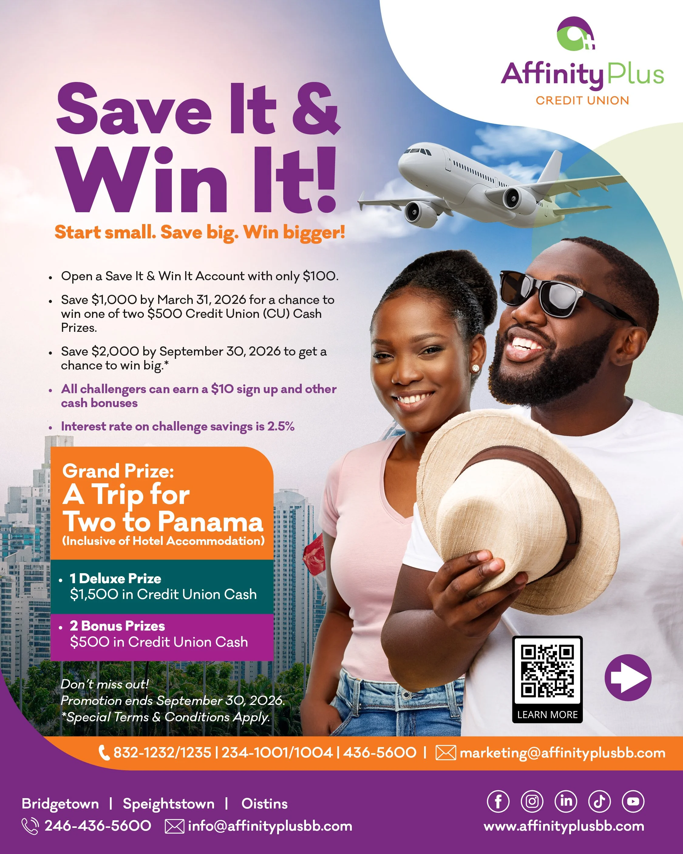 We are making saving more rewarding than ever. With our new Save It & Win It Challenge, you can grow your savings, earn a guaranteed premium interest rate, and unlock chances to win amazing bonuses and prizes – including a trip for two to Panama!